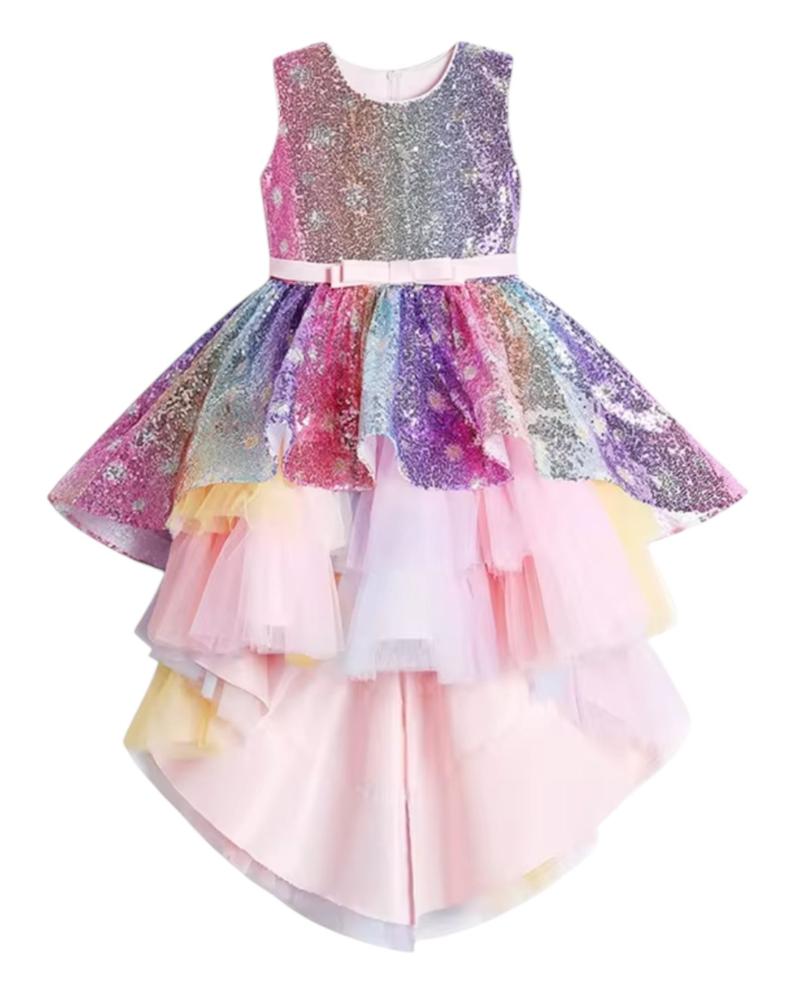 Deze luxe jurk is een echte showstopper! De unieke high-low snit maakt het makkelijk om te bewegen, terwijl de sleep zorgt voor een dramatisch effect. Elke beweging zorgt voor een schitterende regenboog van glitters. Je meisje voelt zich een echte filmster!
