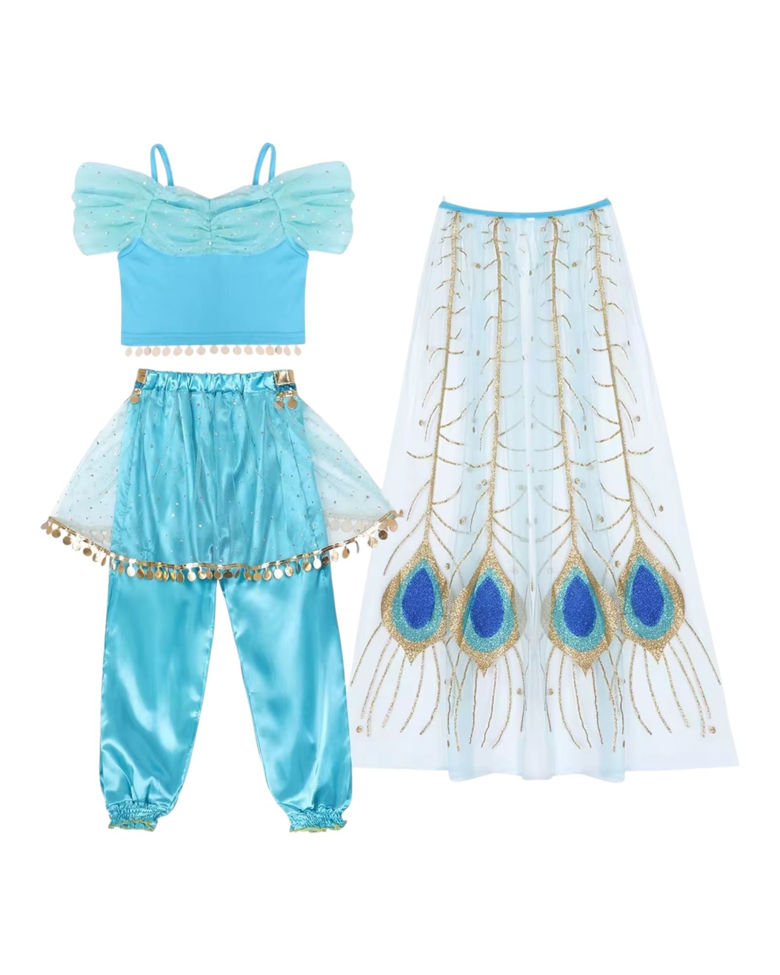 Deze luxe driedelige set maakt het verhaal van Jasmine compleet! De combinatie van glitters, goud en turquoise zorgt voor een authentieke prinsessenlook. Je dochter kan vrij bewegen dankzij de comfortabele broek, terwijl de cape zorgt voor koninklijke allure. Klaar voor een magisch vliegend tapijt avontuur!