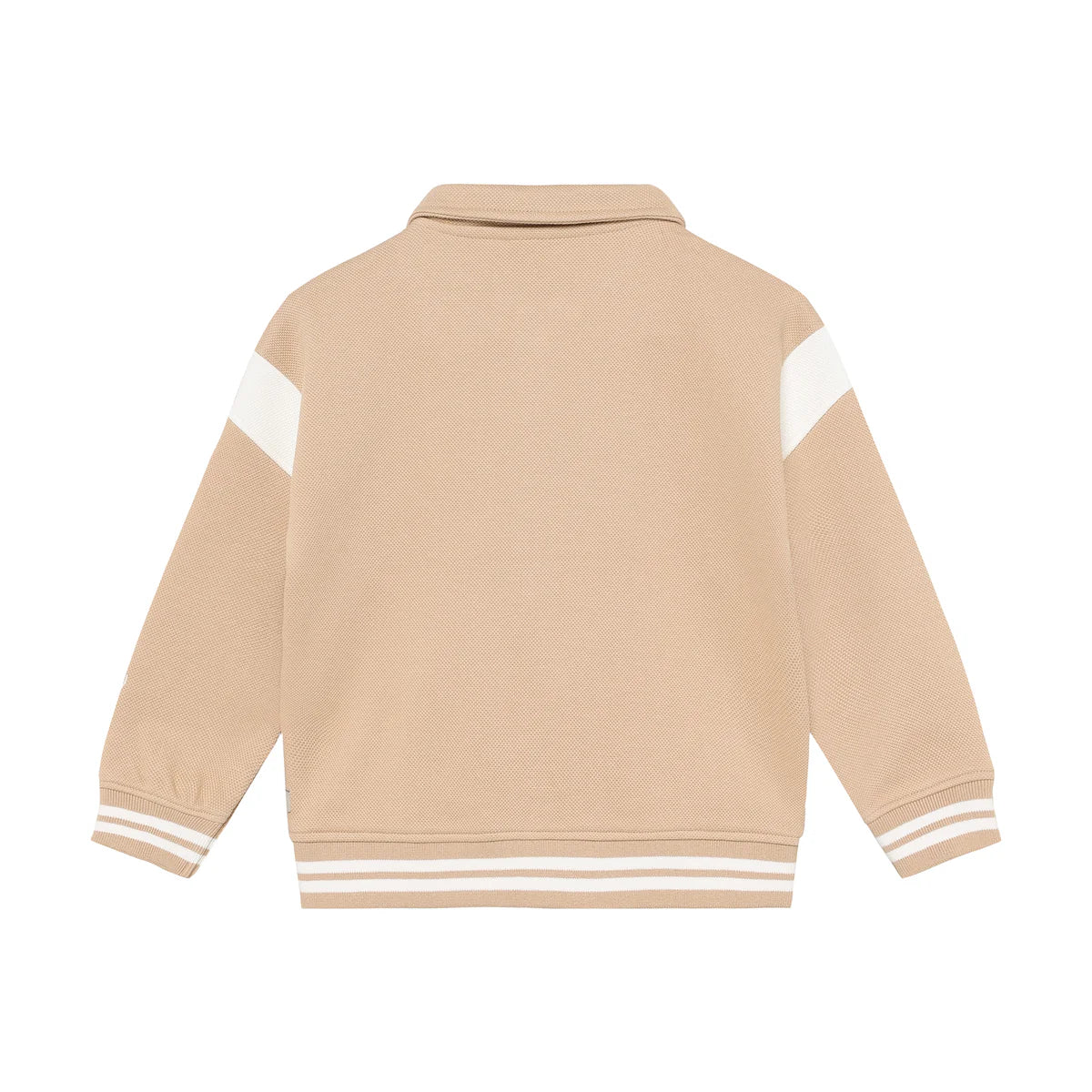 Met zijn zachte latte-kleur, klassieke polokraag en praktische knoopsluiting is dit jasje gemaakt voor kleine avonturiers met grote stijl. De twee handige voorzakken zijn perfect om kleine schatten in op te bergen tijdens het ontdekken van de wereld, in alle comfort en met charme.