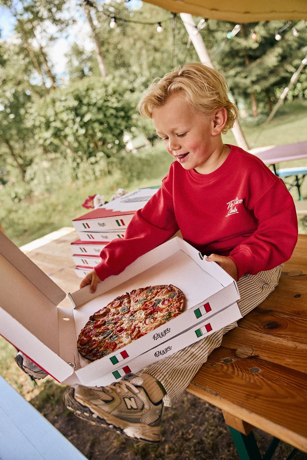 De Slice Club sweater in de zachte kleur Chrysanthemum heeft speelse prints op de voor- en achterkant en is ontworpen voor nieuwsgierige kinderen die altijd onderweg zijn.
