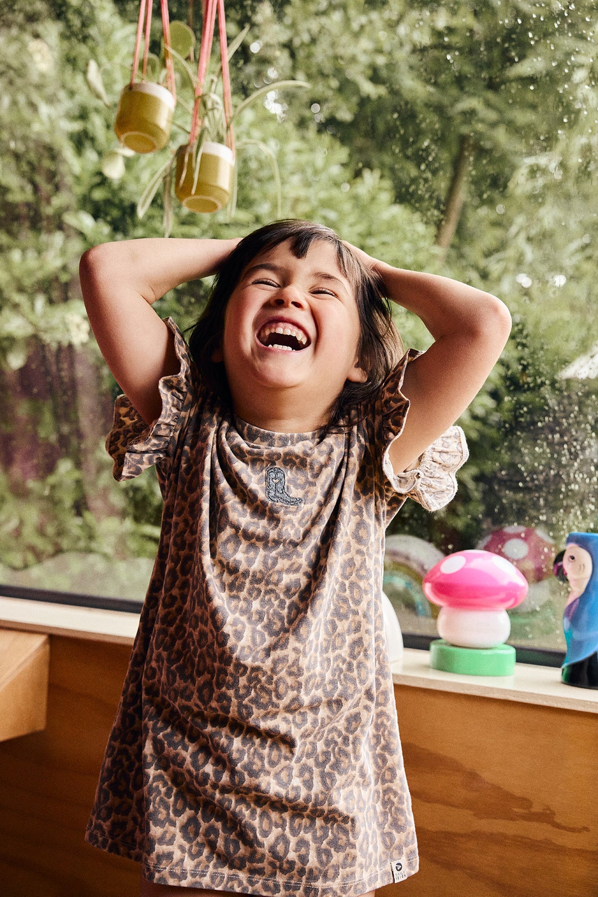 Maak kennis met de T-shirtjurk in Sandshell! Luipaardprint, ruchesmouwen en een charmante kleine cowgirl-laarzenprint — gemaakt voor stijlvolle kleine ontdekkers.
