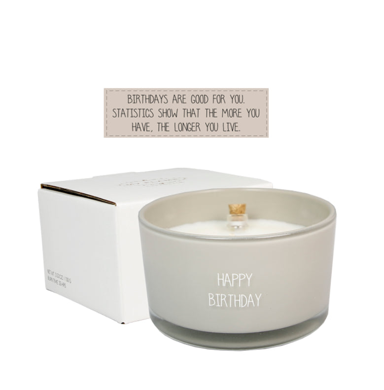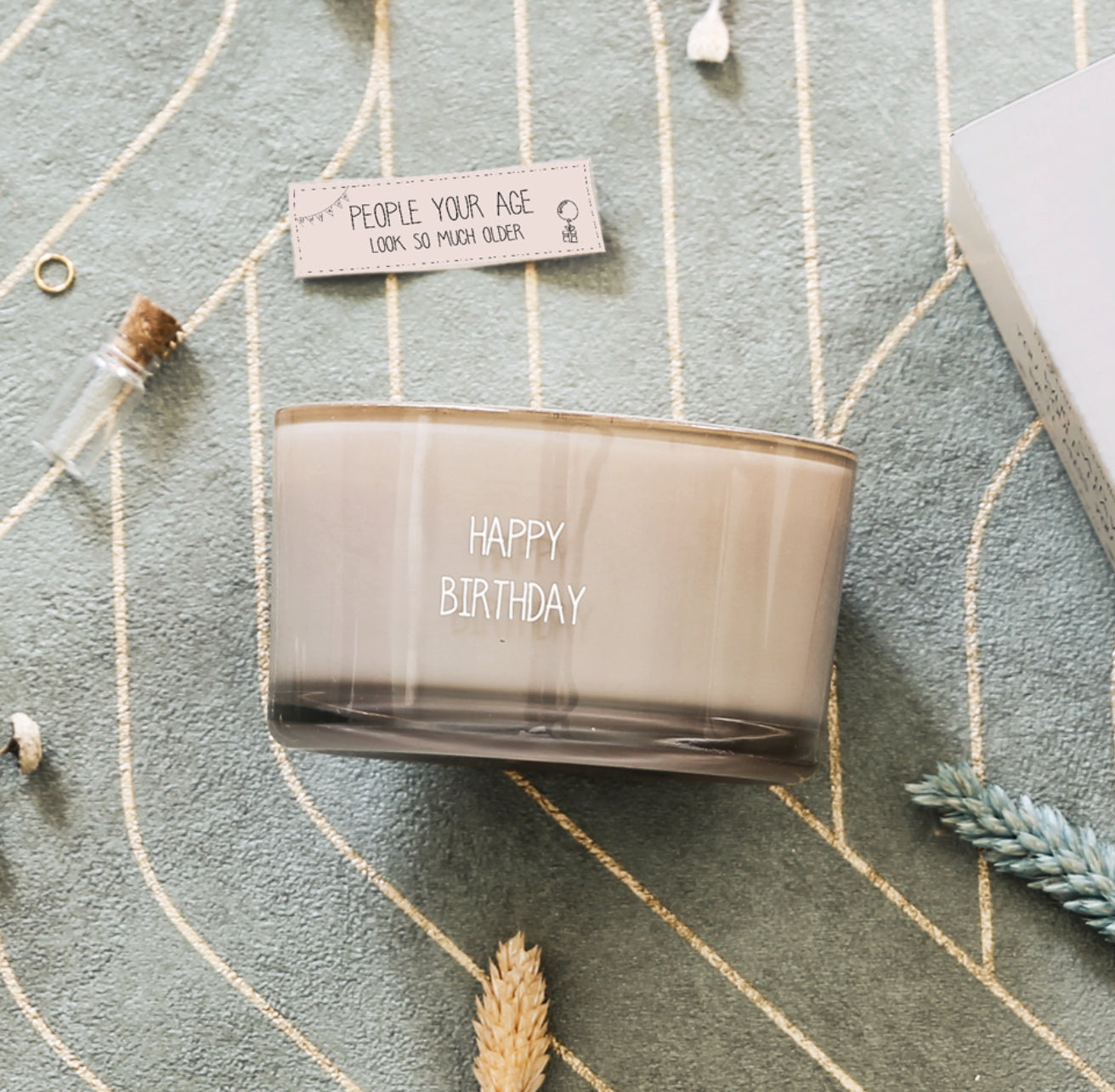 Op de geurkaars staat 'Happy Birthday'. In de wax vind je een flesje met daarin een briefje. Voordat je de kaars brandt kan je het flesje uit de wax trekken, de kurk van het flesje en het briefje eruit halen. Op het briefje staat 'People your age look so much older'. Een mooi cadeau met een leuk complimentje voor de jarige.