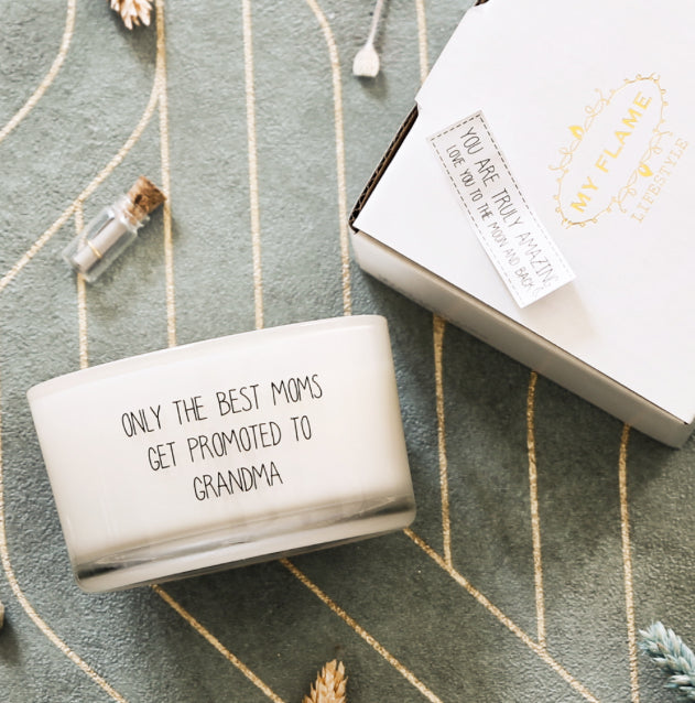 Op de geurkaars staat 'Only the best moms get promoted to grandma'. In de wax vind je een flesje met daarin een briefje. Voordat je de kaars brandt kan je het flesje uit de wax trekken, de kurk van het flesje en het briefje eruit halen. Op het briefje staat 'You are truly amazing. Love you to the moon and back'. Een mooi cadeau met een leuk complimentje.