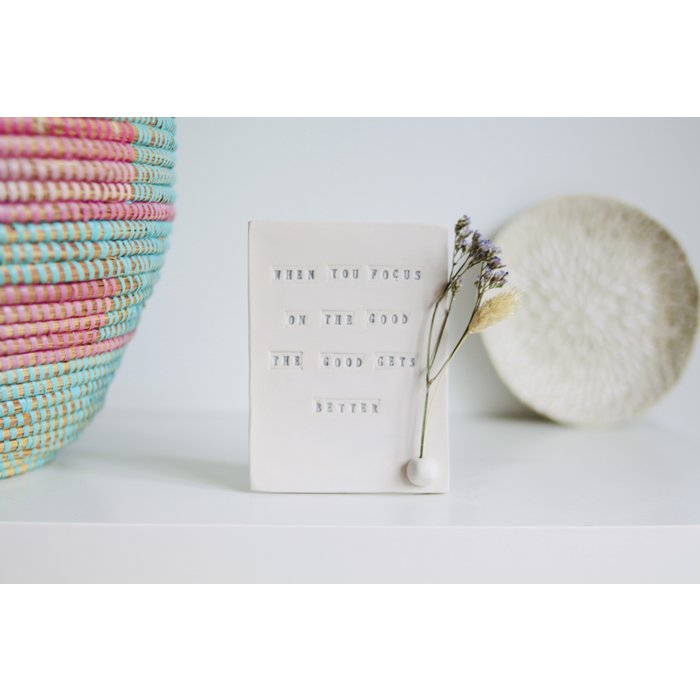 Een geschenkdoosje met een handgemaakte keramiek kaart met tekst.