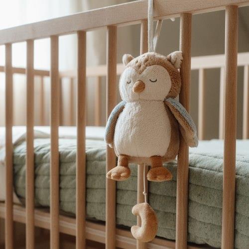 Dit is een muziekdoosje om op te hangen boven de box of het bedje, als decoratie. Graag buiten bereik van je kindje houden en te activeren door een volwassene.