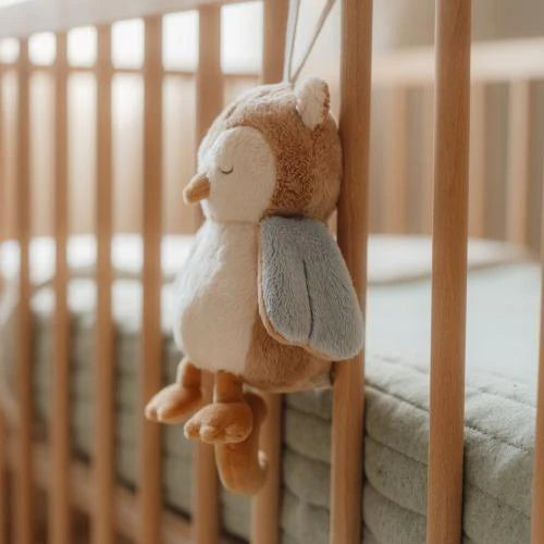 Ga maar lekker slapen. Deze vriendelijke uil leidt je naar een droomwereld vol verwondering en verbeelding. Creëer een vaste routine voor bedtijd met de betoverende melodieën van deze schattige muziekdoos. Trek aan het kleine maantje en het rustgevende slaapliedje begint te spelen terwijl je kleintje heerlijk in slaap dommelt. Een prachtig cadeau en een mooie decoratie voor de babykamer.