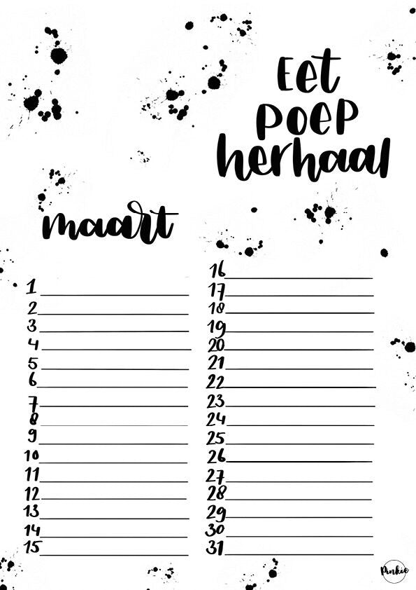 Een kalender vol met poep, kak en pis quotes. Helemaal in Pinkie style zwart wit met spetters.