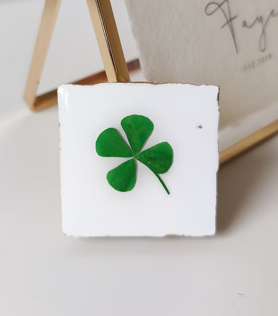 Dit is een echt gedroogd klavertje vier. Afgewerkt met een transparante laag zodat het klavertje niet beschadigt. Ieder tegeltje is uniek. Deze tegeltjes worden met de hand gemaakt in Fez, Marokko. De tegeltjes hebben natuurlijke oneffenheden, stipjes en zijn nooit volledig recht. Dat is de charme van het tegeltje.