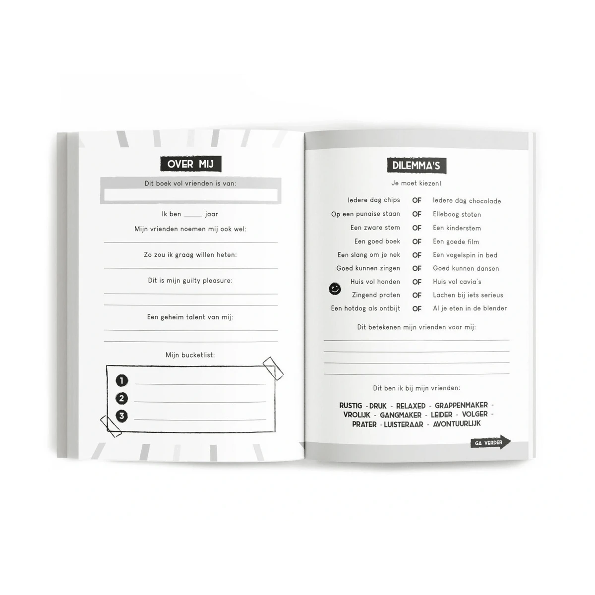 Een boek vol vrienden. Leuk voor nu en voor later! Door dit vriendenboek voor volwassenen leer jij je vrienden nog beter kennen. En dat niet alleen: ook kom je erachter hoe je vrienden over jou denken én je komt meer te weten over jullie vriendschap. In het boek kunnen vrienden dilemma's invullen, tekeningen maken en grappige en leuke vragen beantwoorden. Zo creëer je een fantastisch boek vol herinneringen aan je vrienden. Het is een prachtig boek om later opnieuw terug te lezen en de herinneringen te herbeleven door middel van de leuke foto's en antwoorden van je vrienden. Achterin het boek is er een speciale pagina waarin al je vrienden zichzelf kunnen tekenen! Het boek heeft een softcover met prachtige goudfolie!