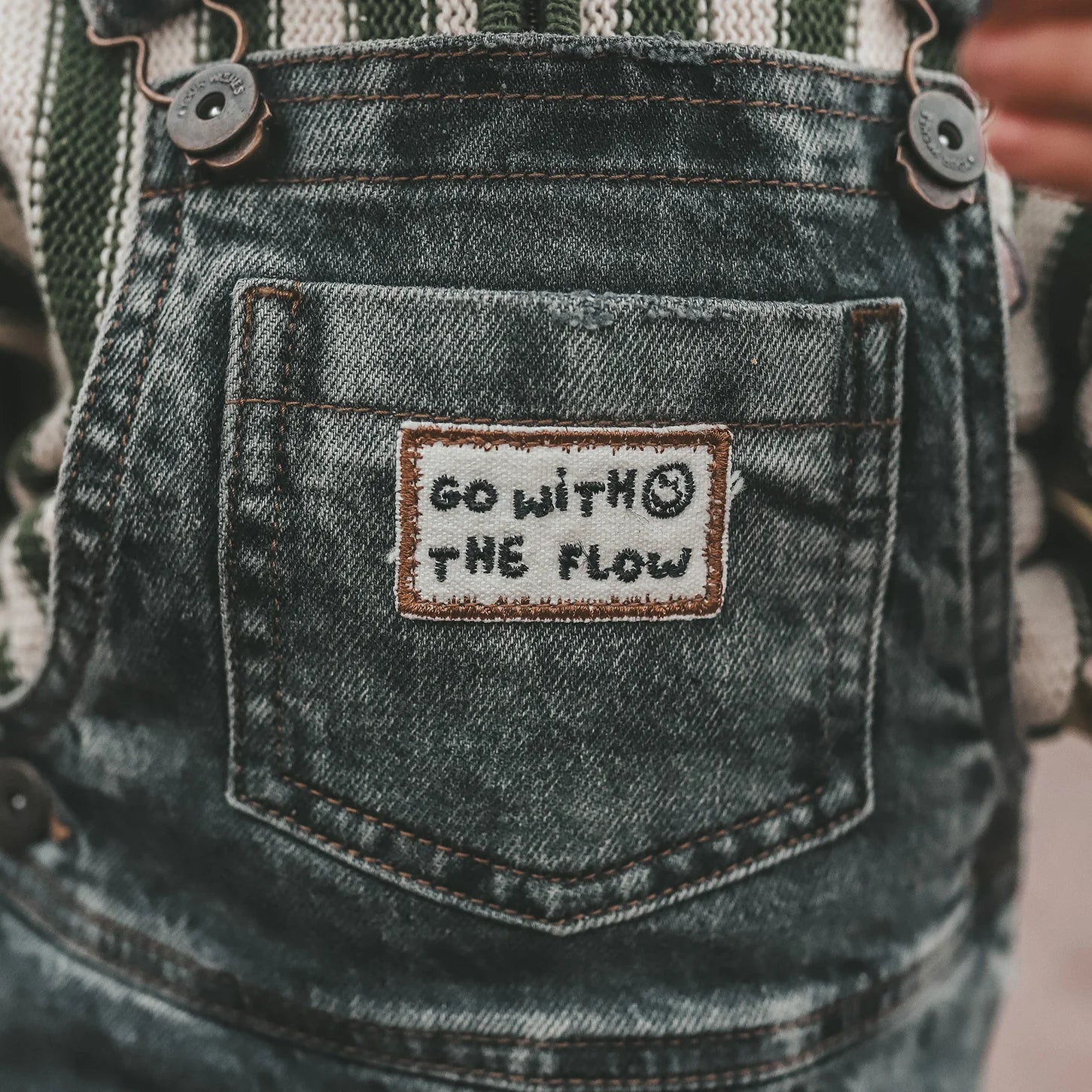 Deze dungarees heeft nog veel meer dan je wensen doen overslaan. Zoals een borstzak waar jouw jongen leuke schatten in kan bewaren, met een patch "go with the flow" erop. De broek heeft geen ritssluiting, maar doet dit wel lijken. Dit maakt het nog makkelijker voor kinderen om het tuinpak aan te doen, niet te veel poespas. De achterkant heeft nog een fijne kontzak, om het wat meer body te geven.