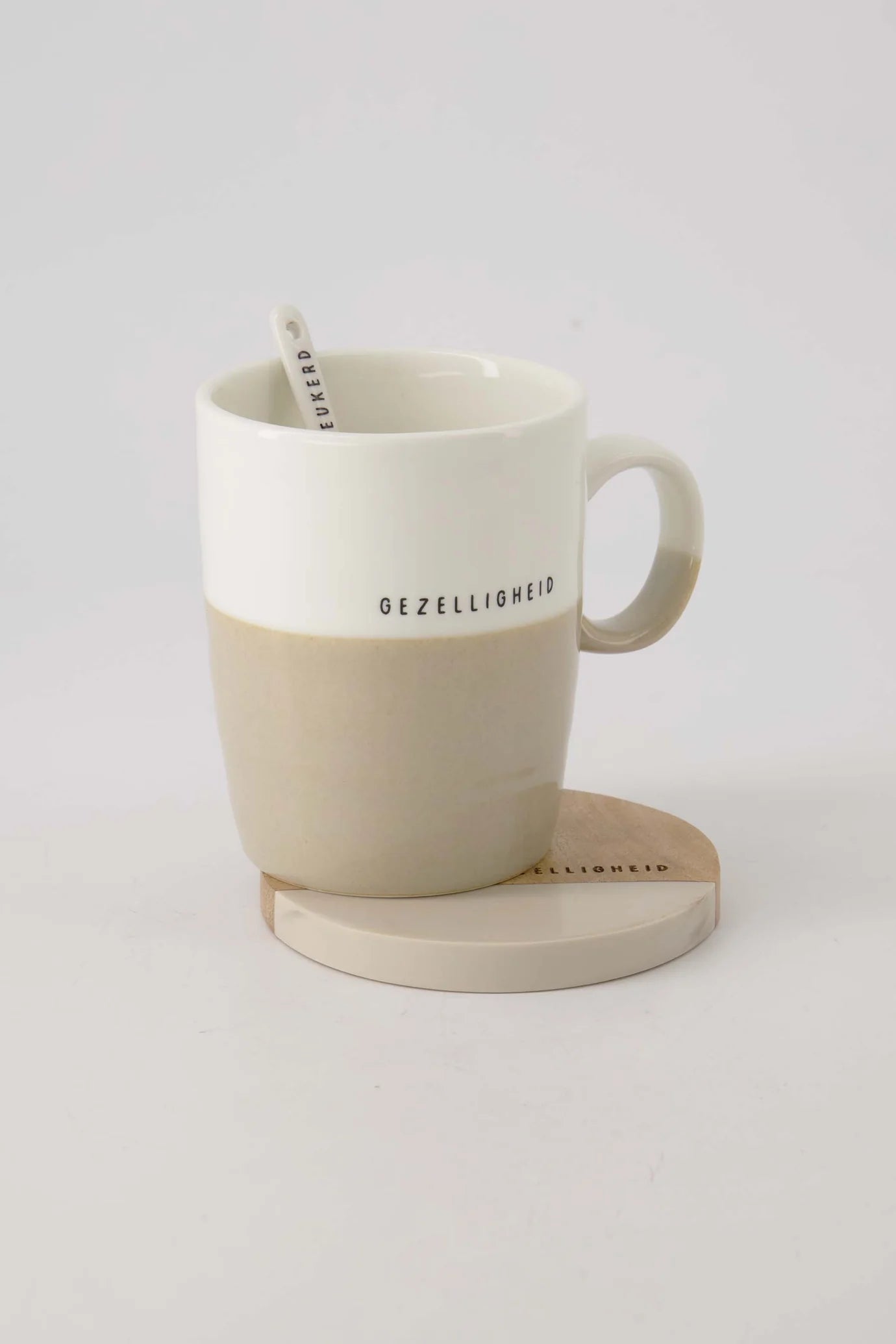 De Zusss theemok gezelligheid is perfect voor jouw ochtend- of middagthee. Deze keramische mok combineert een warme witte bovenkant met een zacht zandkleurige onderkant, wat een sfeervolle uitstraling geeft. Met het fijne handvat ligt de theemok gezelligheid prettig in de hand en laat hij je extra genieten van je momentje rust. De mok past prachtig in elke keuken en is een echte toevoeging binnen onze collectie keukenaccessoires.