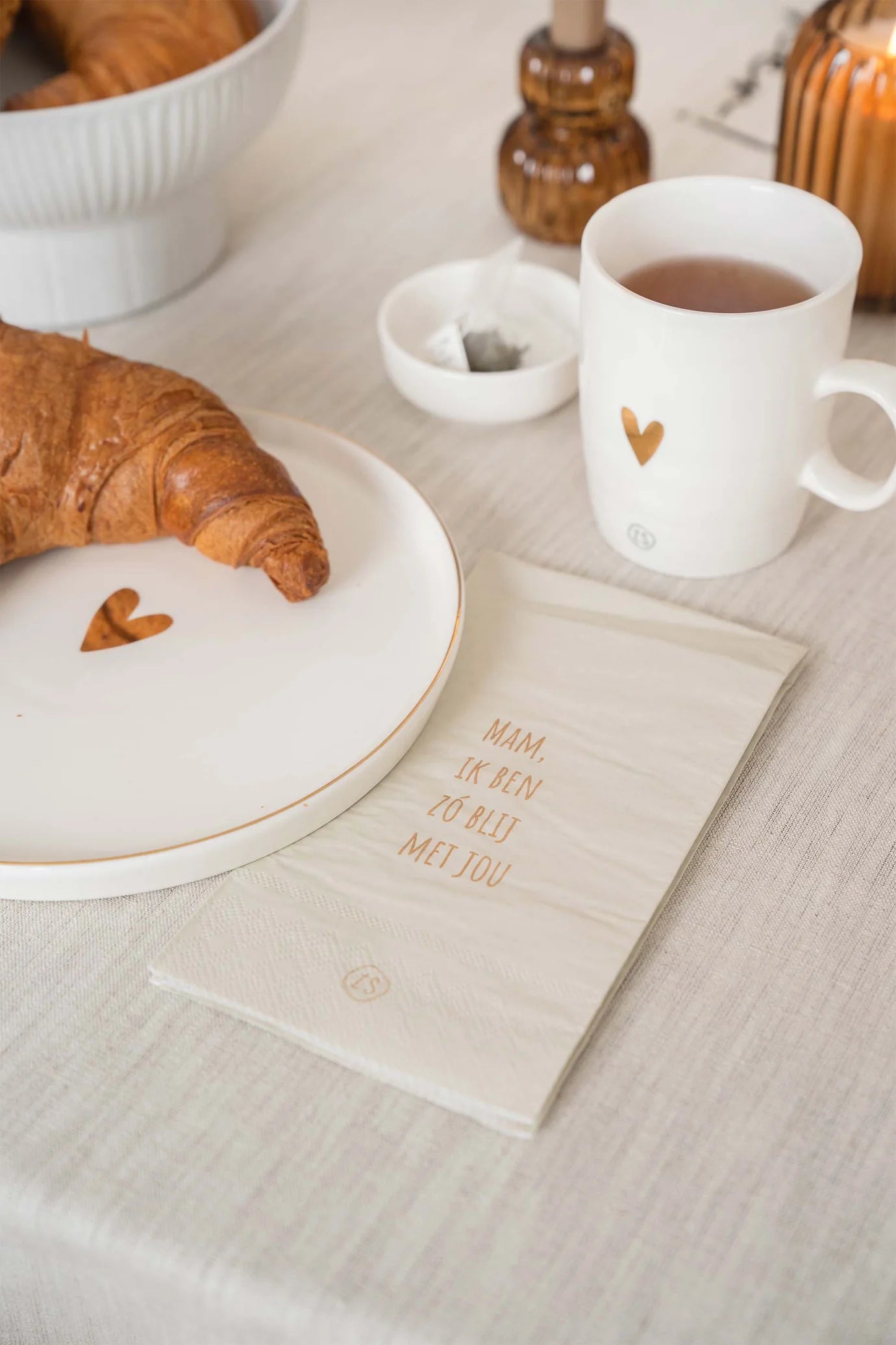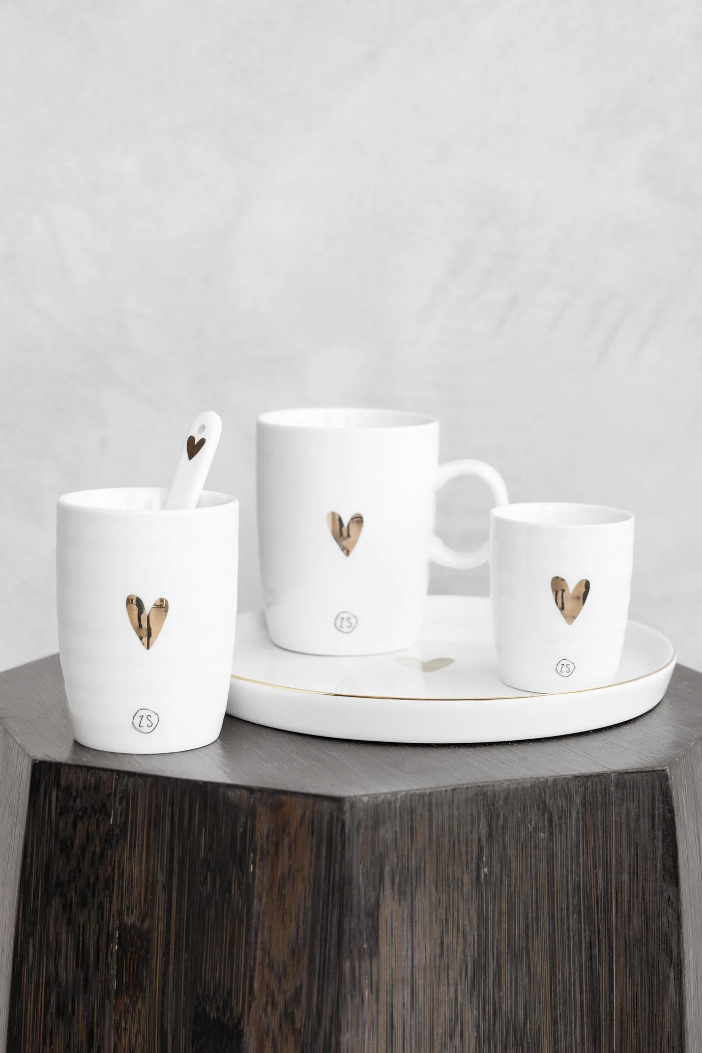 Theemok van Zusss met een gouden hartje erop. Kenmerkend van goud geglazuurd servies is dat dit niet in de vaatwasser kan, vandaar dat je deze mok ook met de hand af moet wassen. Het product is ook niet magnetronbestendig. De mok is gemaakt van aardewerk en is 8cm breed en 10cm hoog. Daardoor past er lekker veel thee in, namelijk 300ml! De theemok heeft een oor. Op de voorkant van het mokje vind je ook een subtiel Zusss logo. Leuk om deze theemok te combineren met ander aardewerk items met gouden hartjes. Je bekijkt ze in de categorie keuken.